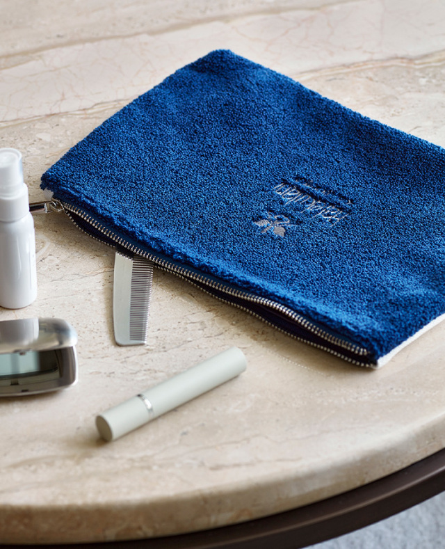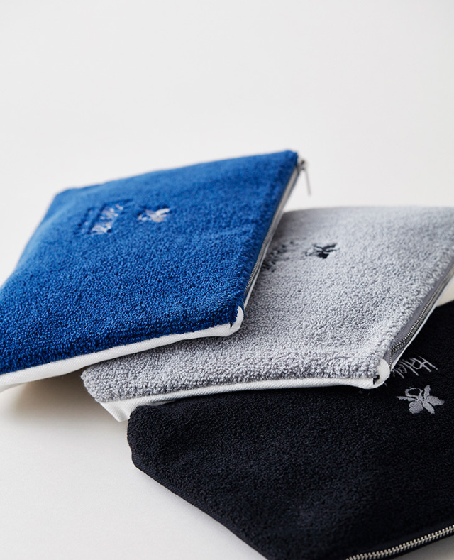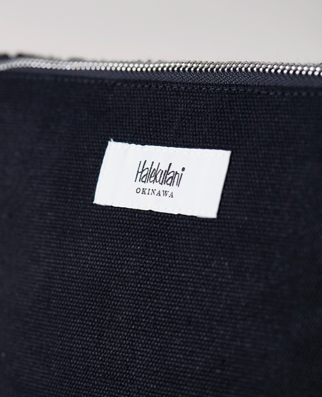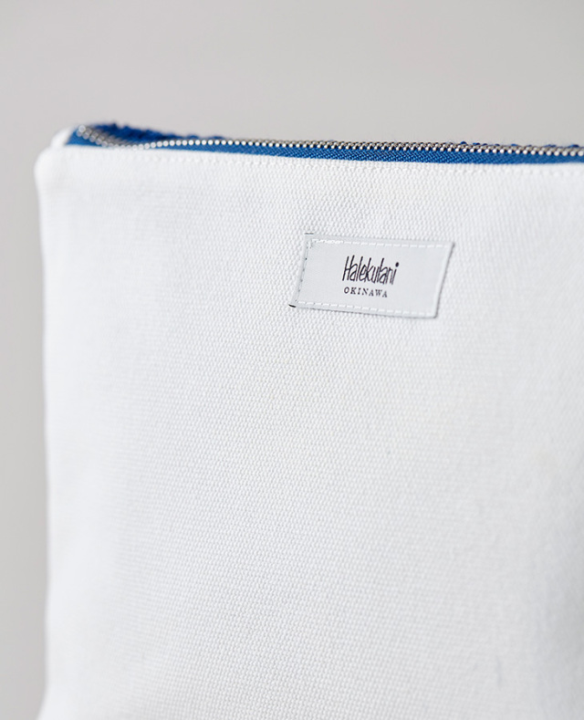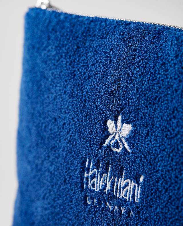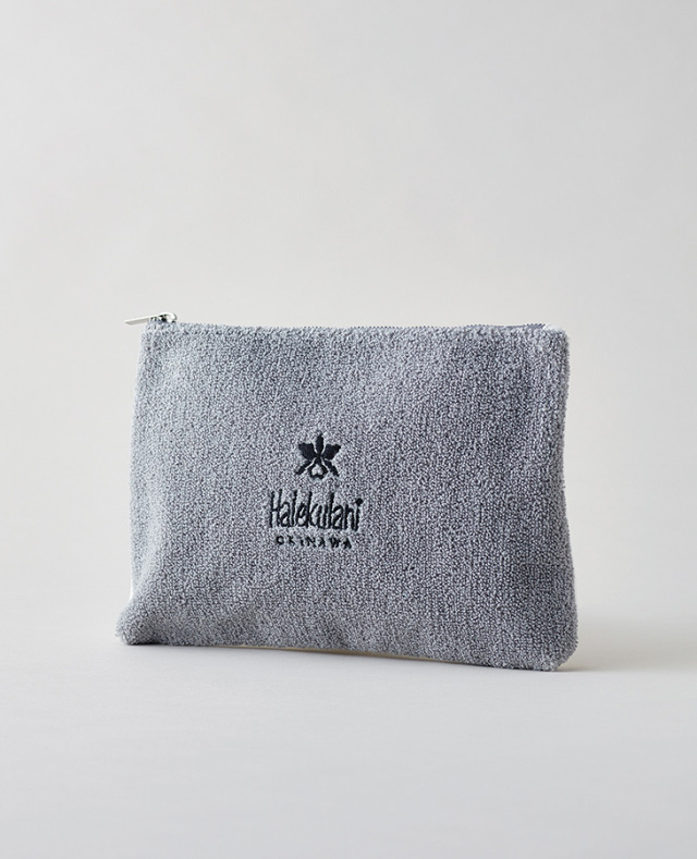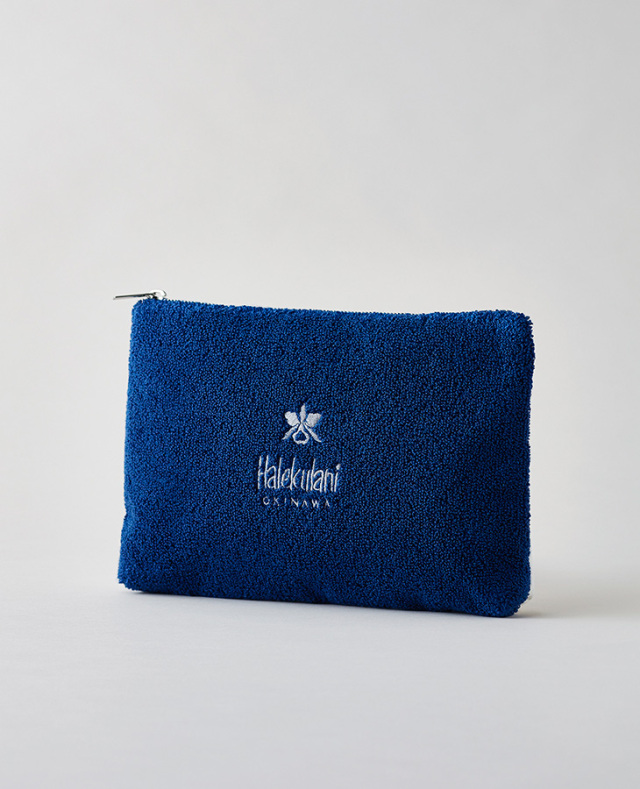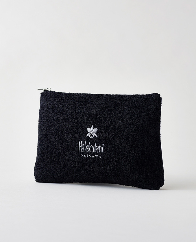 ボリューム感がありふんわりとした手触りが優しい風合いのさがら刺繍のポーチ。表面はオーキッドマーク、裏面はハレクラニロゴをあしらっています。